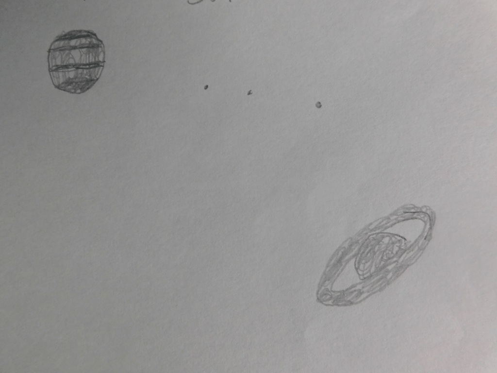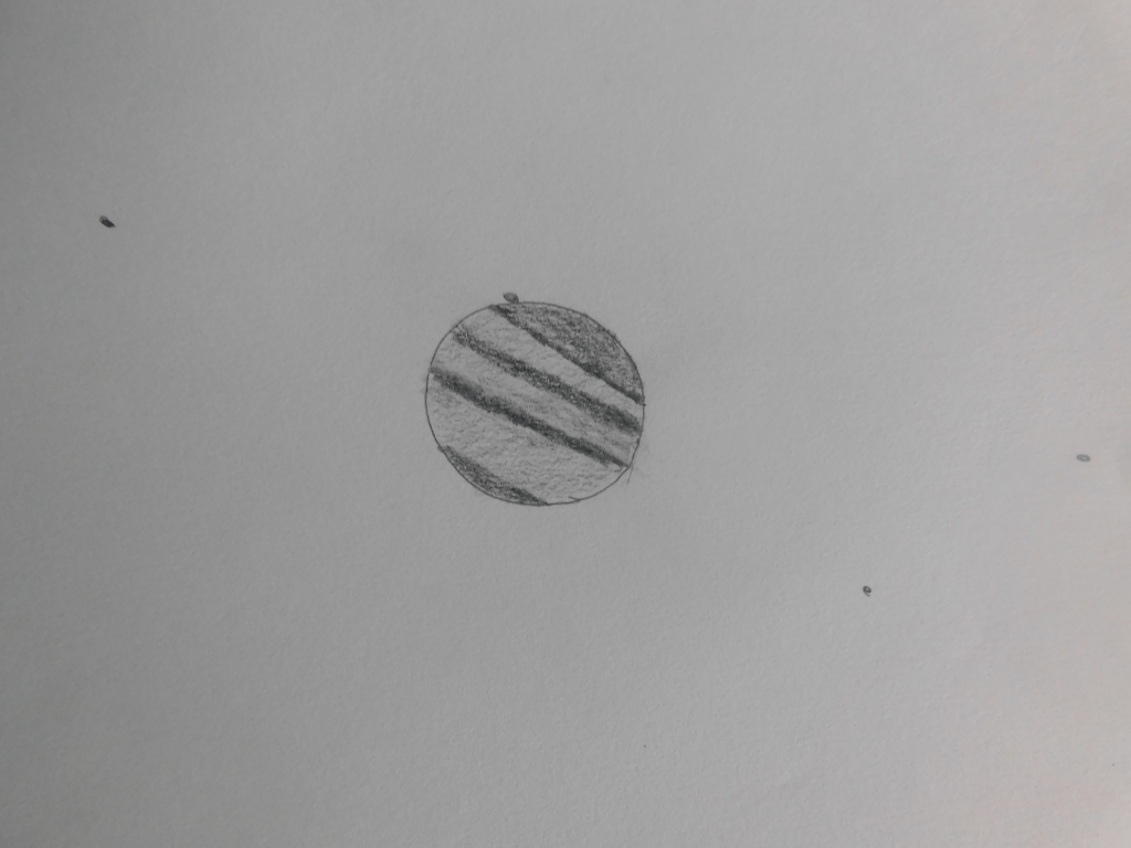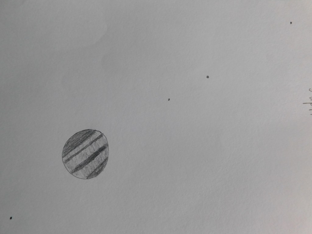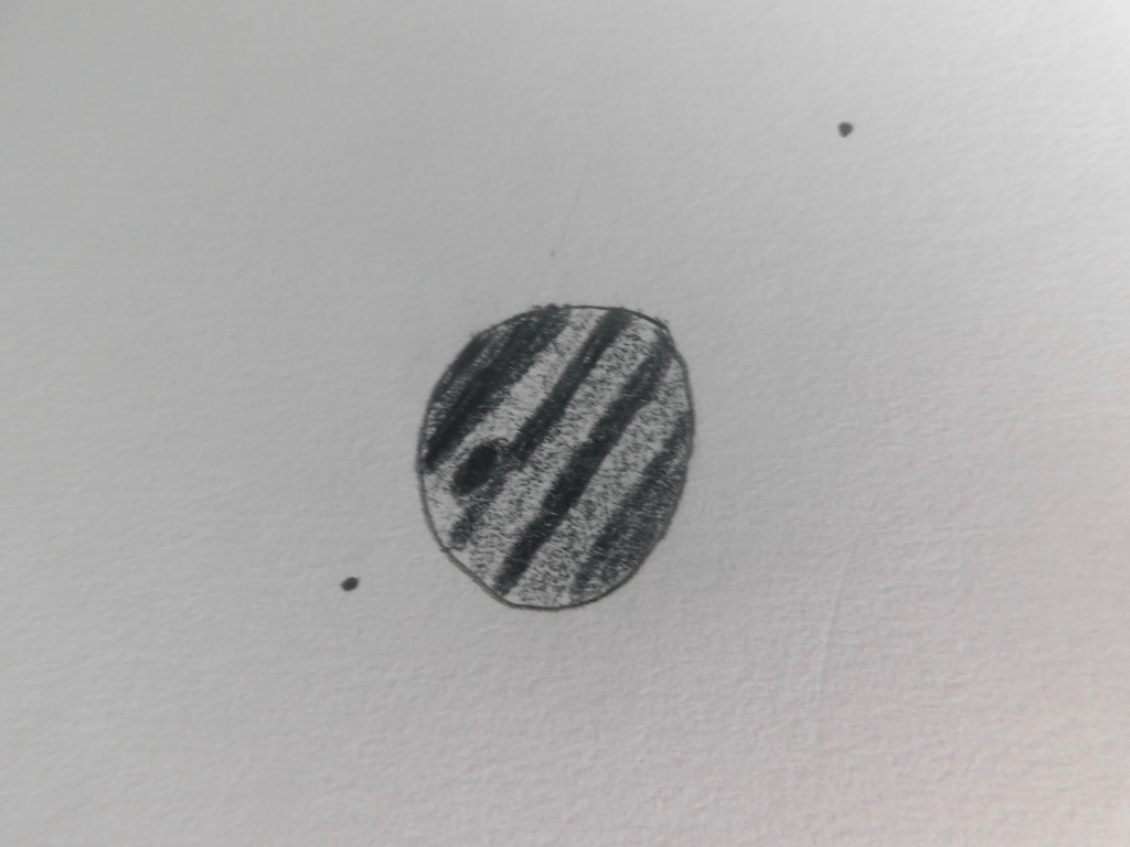 When I got my telescope in 2015, that night after seeing the moon, I saw my first ever planet, Jupiter. You can see a lot of detail on Jupiter, the two distinctive stripes can be seen, probably with a less powerful telescope than the six inch telescope I was using at the time, and four of Jupiter’s moons, Europa, Io, Callisto and Ganymede, these are known as the Gallilean moons, and can easily be seen. In fact, the only reason you need a telescope to see the Gallilean moons is because Jupiter itself is so bright, if Jupiter wasn’t there you would be able to see the Gallilean moons with the naked eye. And this is just what I saw without astronomy sketching. When I started astronomy sketching, which trains the eye to see more, I saw a lot more detail. This is my first astronomy sketch of Jupiter, it’s not good, because it was my first attempt and I could see the clouds moving in so I wanted to get it done fast, but maybe the original is always best! I lie, this is definately my worst sketch of Jupiter.