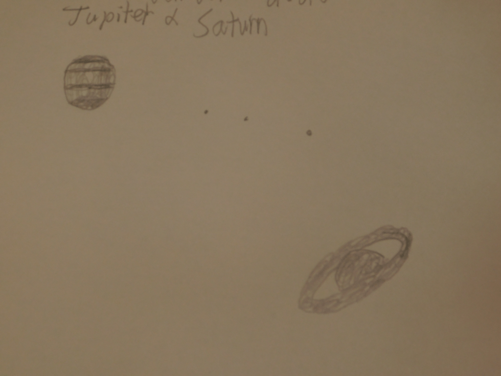 And finally, my most recent sketch of Saturn. If I keep screwing up my Saturnian astronomy sketches I’m going to think that’s what Saturn actually looks like. When I picture it in my mind, I will see those seriously wonky rings, and when I see a NASA photo of Saturn, I will think, “That must be an exo planet, Saturn’s rings are much more crooked than that.”