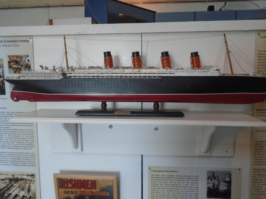 A Model of the Luisitania, a ship torpedoed by a U-boat during WWI, killed almost 2000 people. Just in the shot is a recruitment poster for WWI, “Irishmen Avenge the Lusitania”.